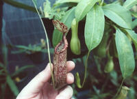 Nepenthes x coccinea - One of the few hybrids I own. I purchased it from the 1999 Texas Nurseryman and Landscape Association Convention in Dallas, Texas. It was a shock to find such a plant there! A lowland hybrid which is a very vigorous grower; a cross between Nepenthes x hookeriana (rafflesiana & ampullaria) then crossed with mirabilis. Leaves easily get over 12 inches, and I bet they can get up to 24 inches! Pitchers are green, with dark red streaks. I don't have much of a pictures, the plant went through shock when I brought it home, and all its pitchers lost their color. Here is a picture of the entire plant, trap, and when they were at the Convention. I'll be attempting propagation for sure! In September 1999, I got two more for my collection, and they did not go through shock.