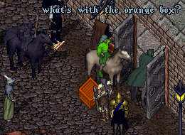 Well, the next night the 'box-owner' gets a hold of me. He hauled the box from the Britian bank all the way to his castle. From what he said, he went through hell and high water getting it there (I can imagine!). He knew how much the box weighed and what was inside with a little trick, but had no idea what was in it. I'm busy raising bard skills, so just spill the beans and tell him about the box.